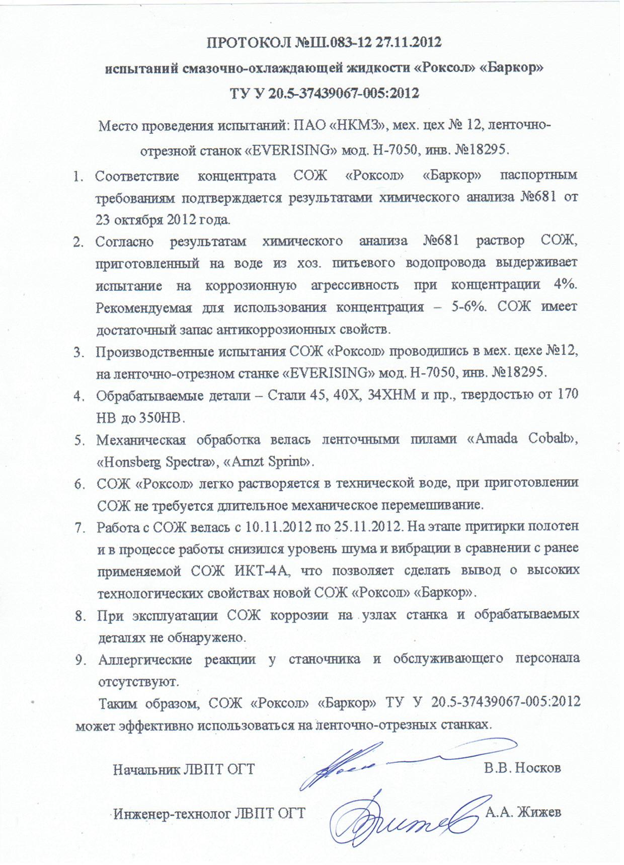3. Виробничі випробування МОР "РОКСОЛ" проводилися в мех. цеху №12, на стрічково-відрізному верстаті "EVEREISING" мод. Н-7050, інв. №18295.